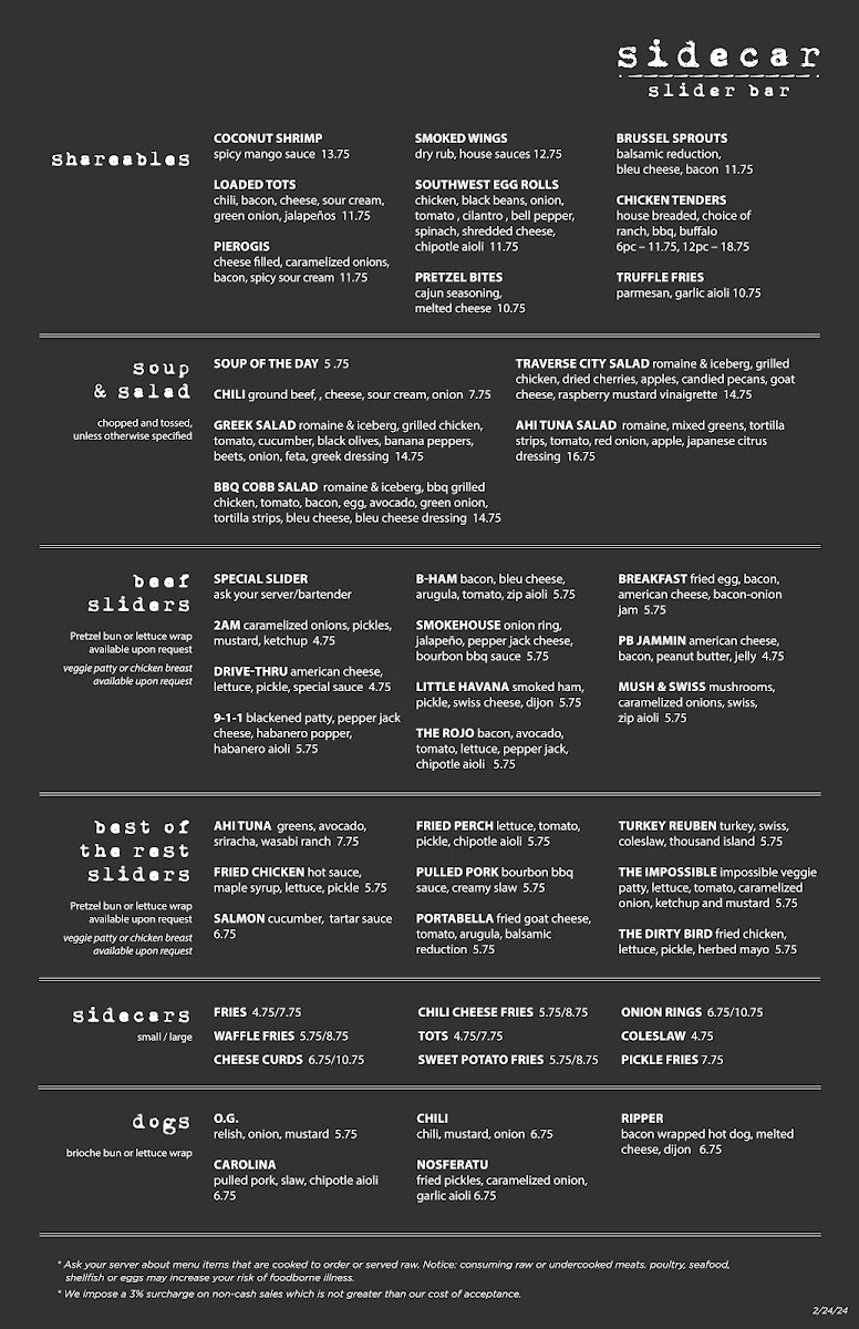 Welcome to Sidecar Slider Bar - Brighton, where sliders and tacos take center stage in a charming downtown setting. Located at 120 W Main St, Brighton, MI, this local gem offers a vibrant menu that promises something for everyone. Indulge in delightful sliders like the Fried Chicken with hot sauce and maple syrup, or the Pulled Pork smothered in bourbon BBQ sauce, each priced affordably at $5.75. Taco enthusiasts can savor options like the Mahi Taco or the Smash Burger Taco, both bursting with flavor.